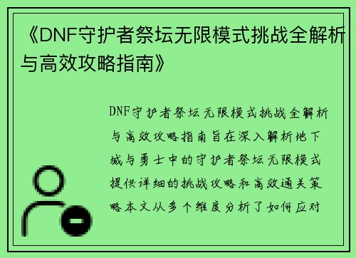 《DNF守护者祭坛无限模式挑战全解析与高效攻略指南》旨在深入解析《地下城与勇士》中的守护者祭坛无限模式,提供详细的挑战攻略和高效通关策略。本文从多个维度分析了如何应对无限模式中的各种敌人、如何构建合适的角色配置、如何应对不同阶段的挑战以及如何优化游戏中的操作与资源管理。通过系统性的讲解,玩家将能够在守护者祭坛无限模式中更好地应对各种挑战,提升自身的通关效率和战斗技巧。
